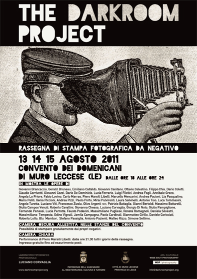 The Darkroom Project è un’iniziativa dedicata alla stampa del negativo in camera oscura, che mira a condurre oltre la semplice visione della stampa fotografica. È un percorso che, attraverso le testimonianze di fotografi e stampatori, permetterà di conoscere il negativo delle fotografie esposte in mostra e scoprire quali siano state le scelte e le intuizioni dello stampatore in camera oscura. Una camera oscura sarà allestita nelle stanze del Convento di Muro Leccese e verrà data la possibilità ai visitatori di conoscere la magia del processo di stampa dai propri negativi, guidati dallo staff di Darkroom Project. Nel corso delle tre serate sarà portata in scena “La Camera Chiara” una performance fotografica di Piero Marsili Libelli, un vero e proprio viaggio nel buio che conduce nell’Afghanistan in guerra.