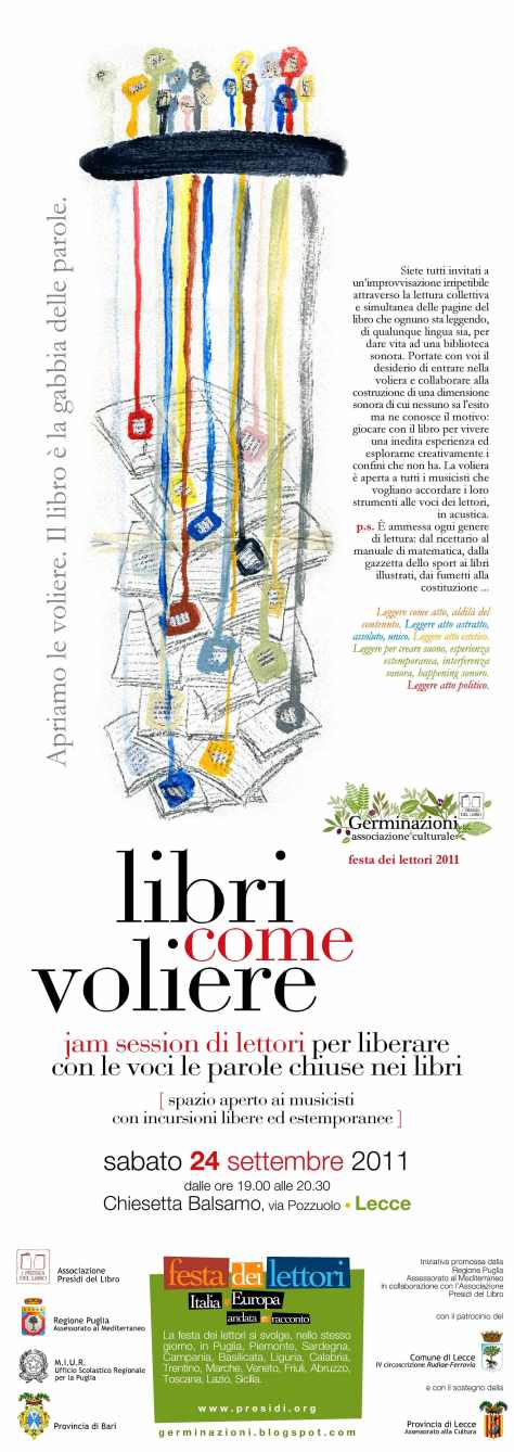 Siete tutti invitati a un’improvvisazione irripetibile attraverso la lettura collettiva e simultanea delle pagine del libro che ognuno sta leggendo, di qualunque lingua sia, per dare vita ad una biblioteca sonora. Portate con voi il desiderio di entrare nella voliera e collaborare alla costruzione di una dimensione sonora di cui nessuno sa l’esito ma ne conosce il motivo: giocare con il libro per vivere una inedita esperienza ed esplorarne creativamente i confini che non ha. La voliera è aperta a tutti i musicisti che vogliano accordare i loro strumenti alle voci dei lettori, in acustica.