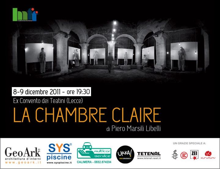 La Chambre Claire, la performance di Piero Marsili Libelli, il cui titolo è una citazione de “La chambre claire di Roland Barthes”, è un vero e proprio viaggio nel buio che conduce nell’Afghanistan in guerra. Il paese è letto e interpretato con un occhio che stravolge e che restituisce l’immagine surreale del volto di un popolo che ha vissuto vent’anni di macerie, fango e polvere. Il fotografo invita il pubblico ad una immersione suggestiva, quasi una trasposizione, di grande impatto emotivo e stupore.