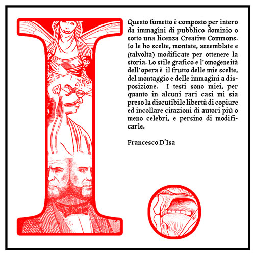 È un paio d’anni che mi è venuta la fissa per i libri cuciti anziché incollati, esattamente da quando alcune case editrici hanno cominciato a fare uscire le loro novità in edizioni incollate vendendole allo stesso prezzo di un libro fatto come si deve. Ma tant’è, abituato all’inchiostro che si è trasformato in toner e alla rilegatura che si apre a metà volume spaginando i fogli di un’edizione tascabile, prende bene vedere che esistono ancora libri-libri. Questo volume, ideato e realizzato da Francesco D’Isa, è un “fumetto composto per intero da immagini di pubblico dominio o sotto una licenza Creative Commons. Io le ho scelte, montate, assemblate e (talvolta) modificate per ottenere la storia. Lo stile grafico e l’omogeneità dell’opera sono il frutto delle mie scelte, del montaggio e delle immagini a disposizione. I testi sono miei, per quanto in alcuni rari casi mi sia preso la discutibile libertà di copiare ed incollare citazioni di autori più o meno celebri, e persino modificarle”; è questa la migliore spiegazione di ciò che vedranno i nostri occhi scorrendo le oltre trecento pagine del volume.