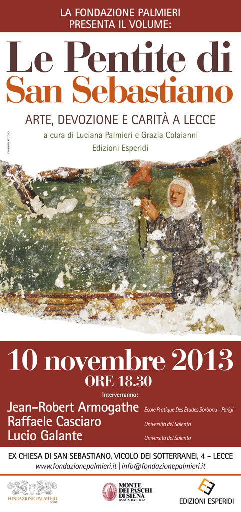 Sarà presentato ufficialmente domenica 10 novembre 2013, h. 18.30, a Lecce, presso la Fondazione Palmieri onlus sita nella Chiesa di San Sebastiano, Vico dei Sotterrani, il volume “Le Pentite di San Sebastiano. Arte, devozione e carità a Lecce”, (a cura) di Luciana Palmieri e Grazia Colaianni, edito da Edizioni Esperidi.