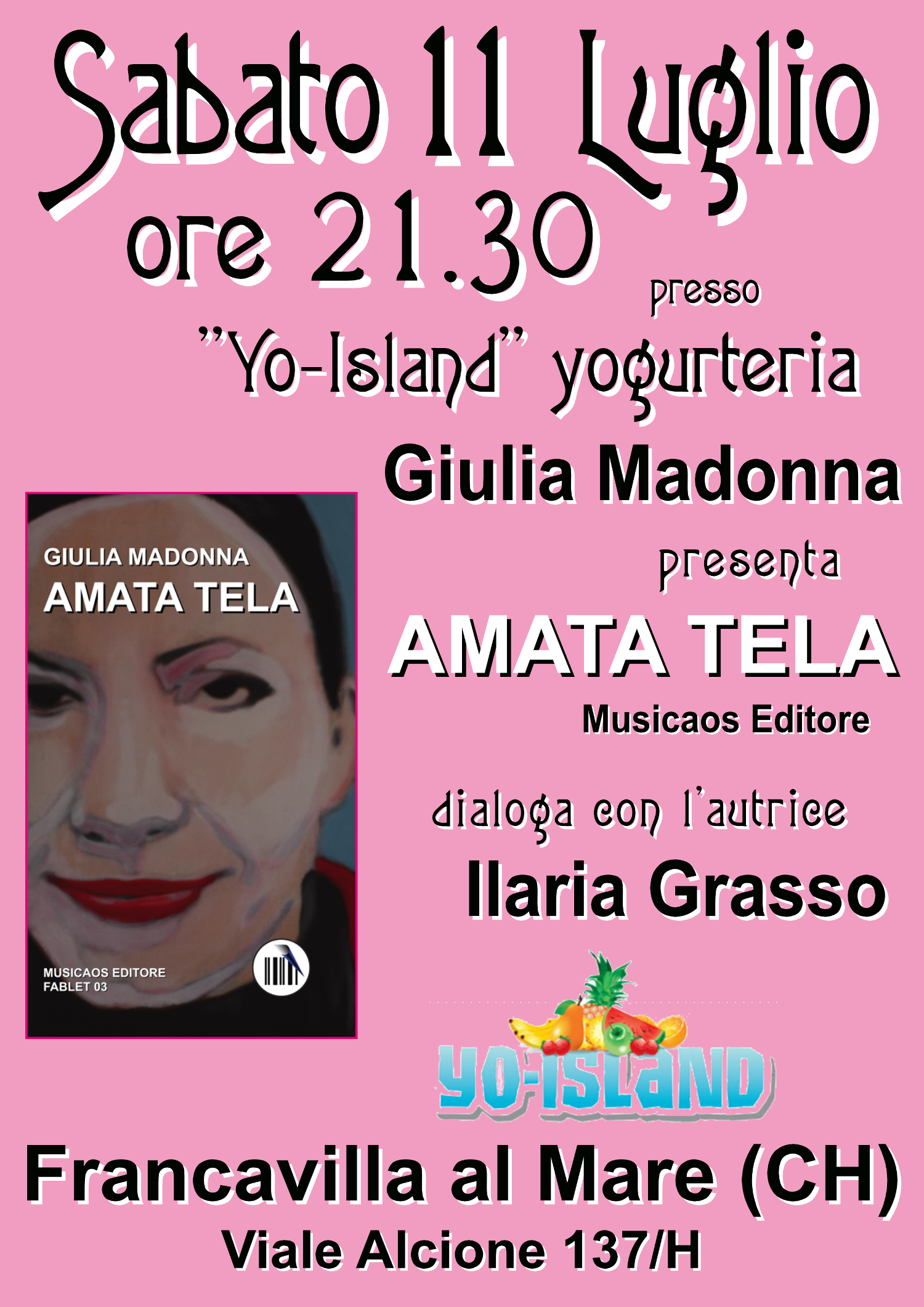 Sabato 11 Luglio, alle ore 21.30, nei locali della yogurteria “Yo – Island” di Francavilla Al Mare, in via Alcione 137/H, la scrittrice Giulia Madonna presenterà il suo romanzo “Amata tela”, Ilaria Grasso dialogherà con l’autrice.