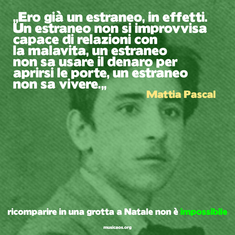 Mattia Pascal 19 novembre 2020 4017 × 4017 A Natale sarà impossibile… “Ero già un estraneo, in effetti. Un estraneo non si improvvisa capace di relazioni con la malavita, un estraneo non sa usare il denaro per aprirsi le porte, un estraneo non sa vivere.”
