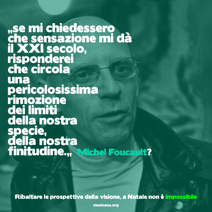 Michel Foucault 19 novembre 2020 4017 × 4017 A Natale sarà impossibile… “Se mi chiedessero che sensazione mi dà il XXI secolo, risponderei che circola una pericolosissima rimozione dei limiti della nostra specie, della nostra finitudine.”