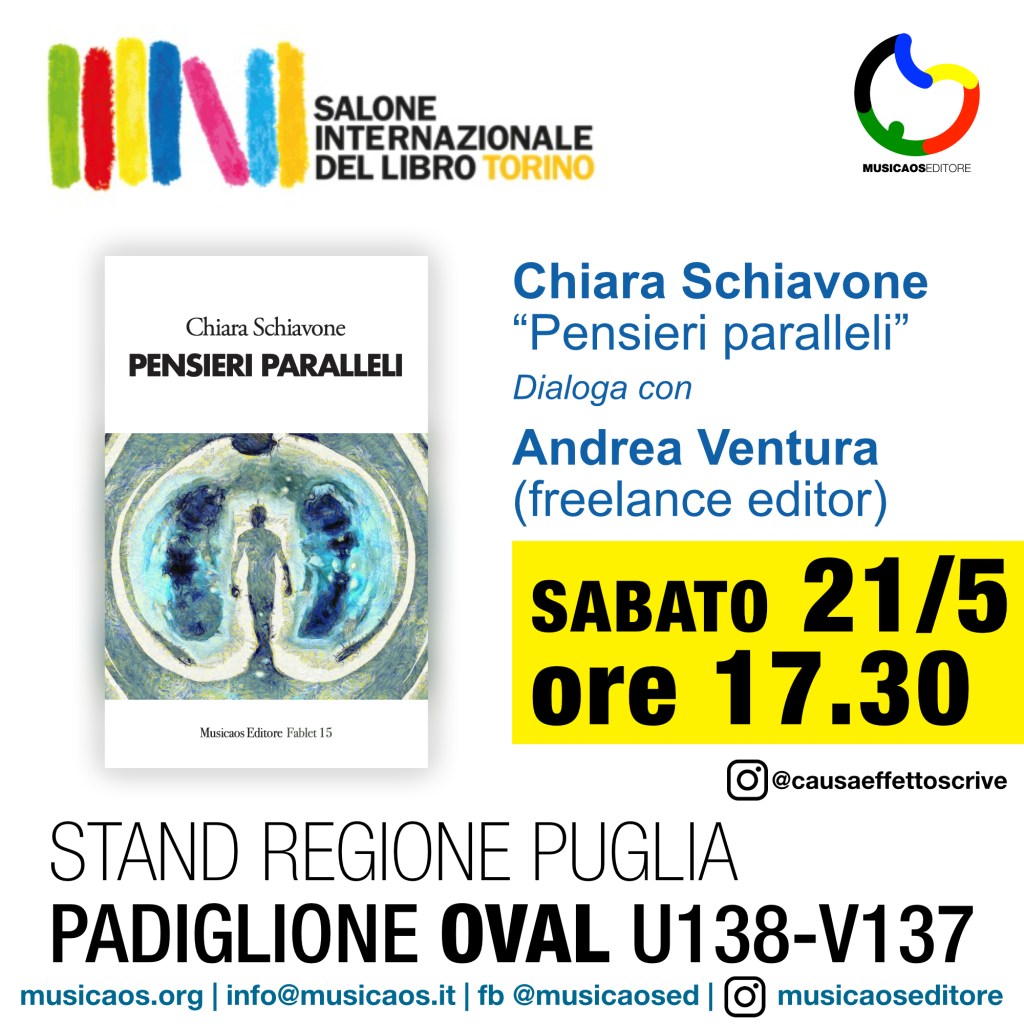 Sabato 21 Maggio – Ore 17.30 Stand Regione Puglia Padiglione OVAL U138-V137 Chiara Schiavone presenta “Pensieri paralleli” (Musicaos Editore)