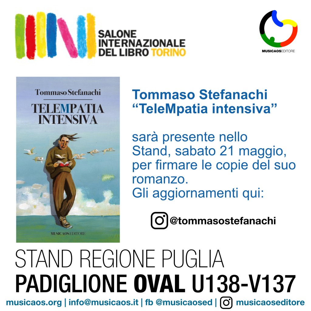 Sabato 21 Maggio Stand Regione Puglia Padiglione OVAL U138-V137 Tommaso Stefanachi, firmacopie “TeleMpatia intensiva”