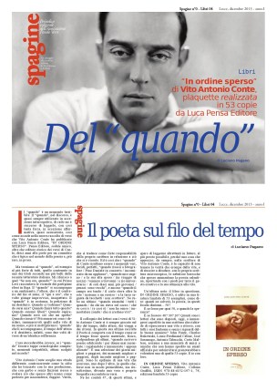 Il “quando” è un momento terribile. Il “quando”, nel discorso, è quasi sempre utilizzato in accezione interrogativa, di rado mi è successo di leggerlo, con così tanta forza, in accezione affermativa, quasi accusatoria, così come accade nella nuova raccolta di versi che Vito Antonio Conte ha pubblicato con Luca Pensa Editore, “IN ORDINE SPERSO”. Pensa Editore, sodale amico, oltre che editore storico dei versi di Conte, dieci anni alle porte per un connubio che è tipico nel mondo della poesia e, più raro, in prosa.